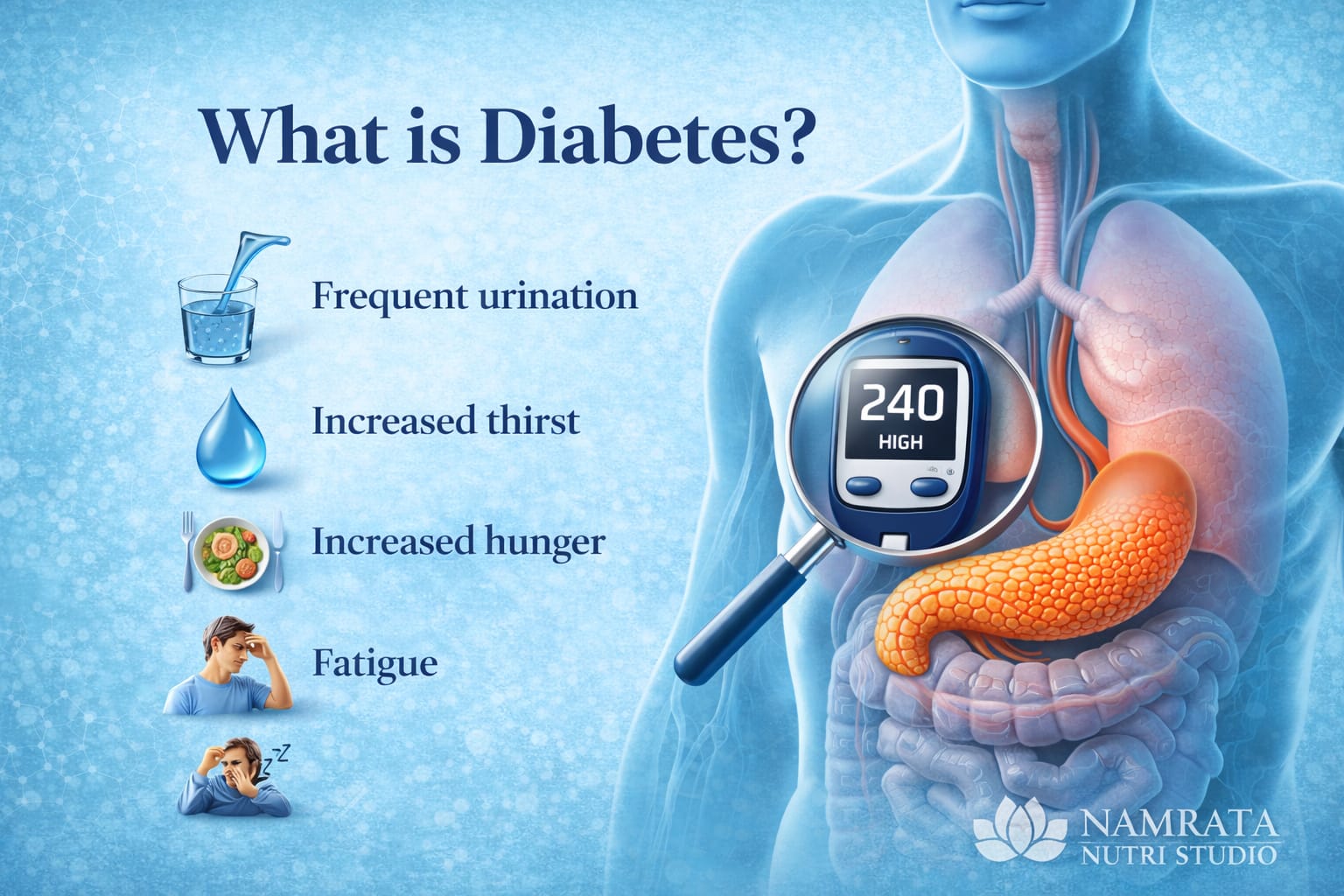 Diabetes ek metabolic condition hai jisme body blood glucose ko properly regulate nahi kar paati. Ye insulin ki kami ya insulin resistance ki wajah se hota hai.